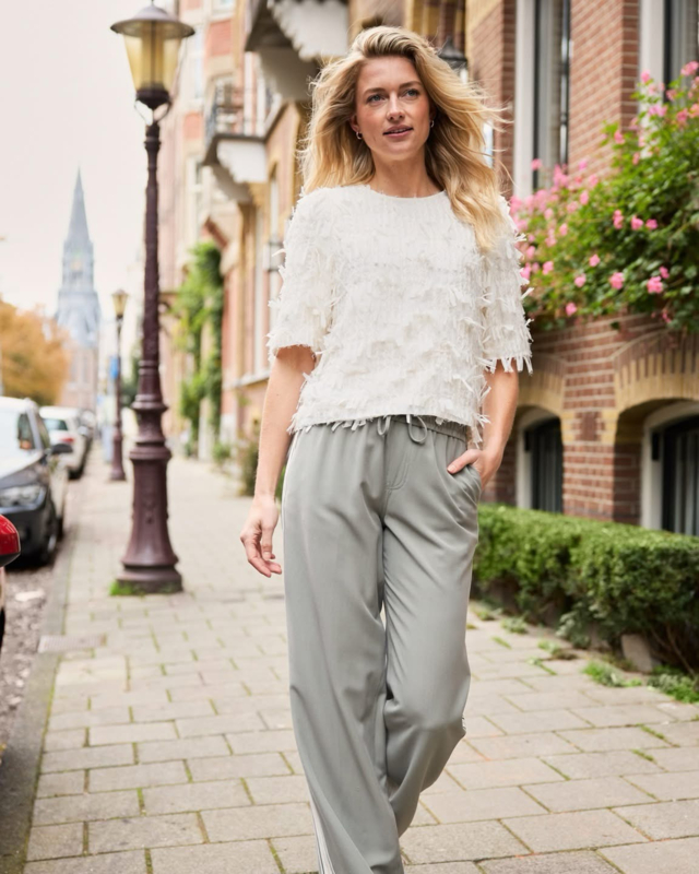 De Claudette Palazzo Sidetape is een wide leg Palazzo broek met een drawstring in de taille en strepen aan de zijkant. Deze broek is gemaakt van een los vallende soepele stof. De Claudette Palazzo Sidetape heeft steekzakken, paspelzakken en een elastische tailleband.