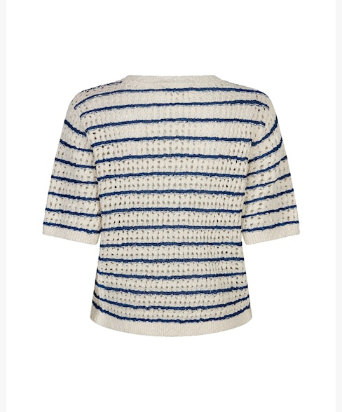 De Jolene Stripe is een grof gebreide top van een zachte kwaliteit met een ronde hals en horizontale strepen. De top heeft een geribde boord bij de hals, mouwen en onderkant. De Jolene Stripe heeft korte pofmouwen en een regular fit.