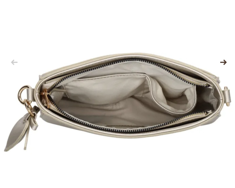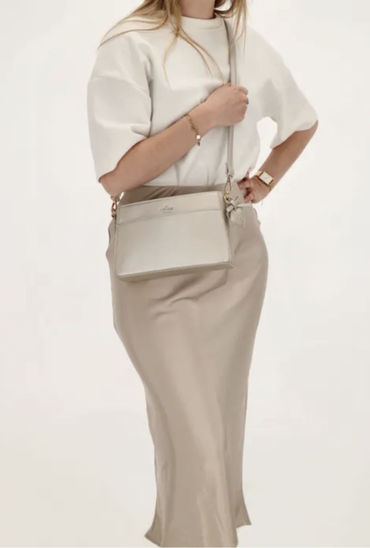 De tas wordt geleverd met twee afneembare schouderbanden: een korte band voor een hand- of schouderlook en een lange, verstelbare band voor comfortabel crossbody gebruik. De goudkleurige hardware en de speelse hanger geven de tas een elegante en vrouwelijke uitstraling.