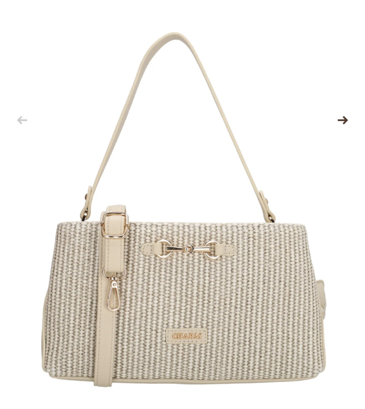 Charm London Santorini Schoudertas ZandDe Charm London Santorini Schoudertas is een stijlvolle tas met een zomerse riet look en een praktische indeling. De tas sluit met een rits zodat je je spullen veilig opbergt en alles netjes op zijn plek blijft.