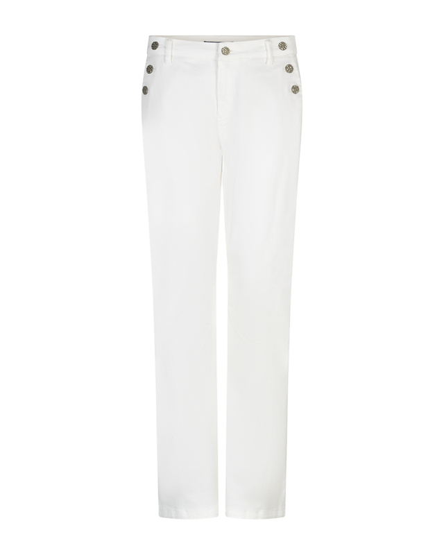 De Bibette Off-White & Buttons is een witte flare broek met een knoopdetail bij de zakken. De broek heeft een hoge taille, een knoopsluiting en steekzakken. De Bibette Off-White & Buttons heeft een aangesloten pasvorm op de…
