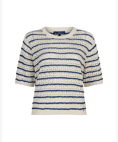 De Jolene Stripe is een grof gebreide top van een zachte kwaliteit met een ronde hals en horizontale strepen. De top heeft een geribde boord bij de hals, mouwen en onderkant. De Jolene Stripe heeft korte pofmouwen en een regular…